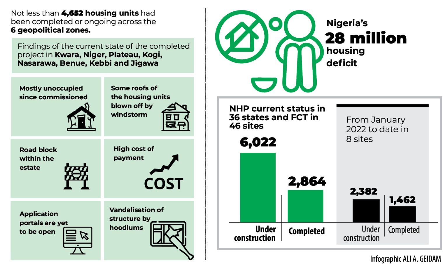 Of the 6,022 housing units billed for construction in 46 sites across the 36 states of the federation and the Federal Capital Territory (FCT), 2,864 are said to have been completed; while others are at various stages of completion.